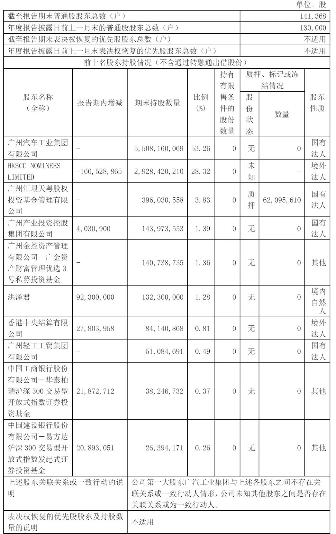 截至2024年12月31日,广州汽车工业集团有限公司持股53.26%,HKSCC NOMINEES LIMITED持股28.32%,广州汇垠天粤股权投资基金管理有限公司持股为3.83%,广州产业投资控股集团有限公司持股为1.39%;