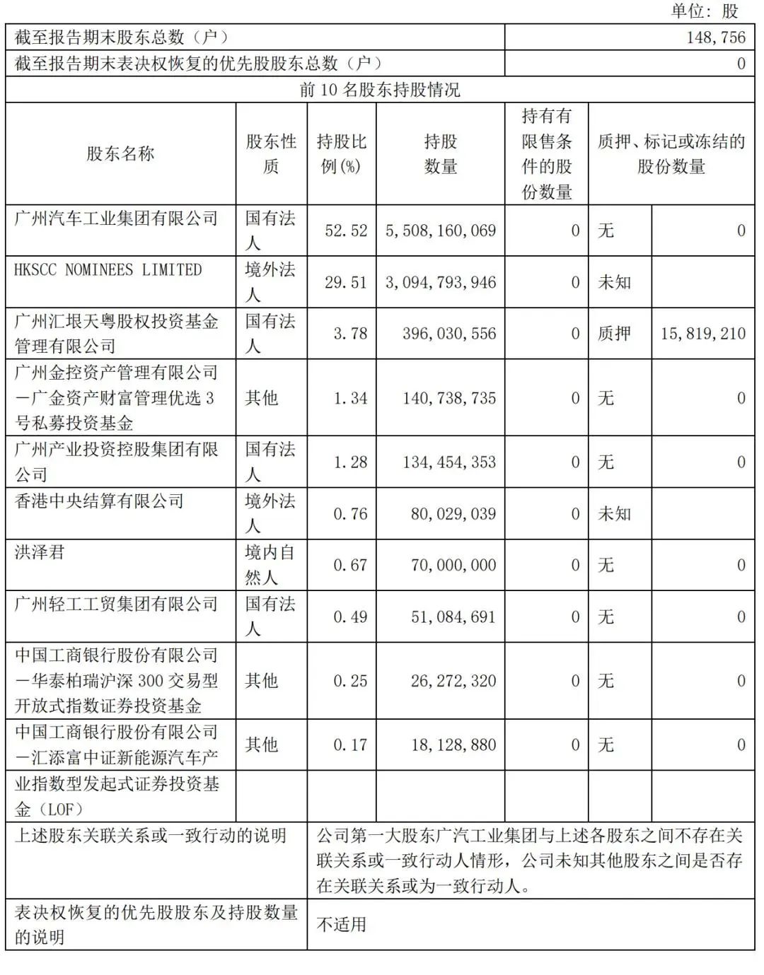 截至2024年6月30日,广州汽车工业集团有限公司持股52.52%,HKSCC NOMINEES LIMITED持股29.51%,广州汇垠天粤股权投资基金管理有限公司持股为3.78%,广州金控资产管理有限公司-广金资产财富管理优选 3 号私募投资基金持股为1.34%;