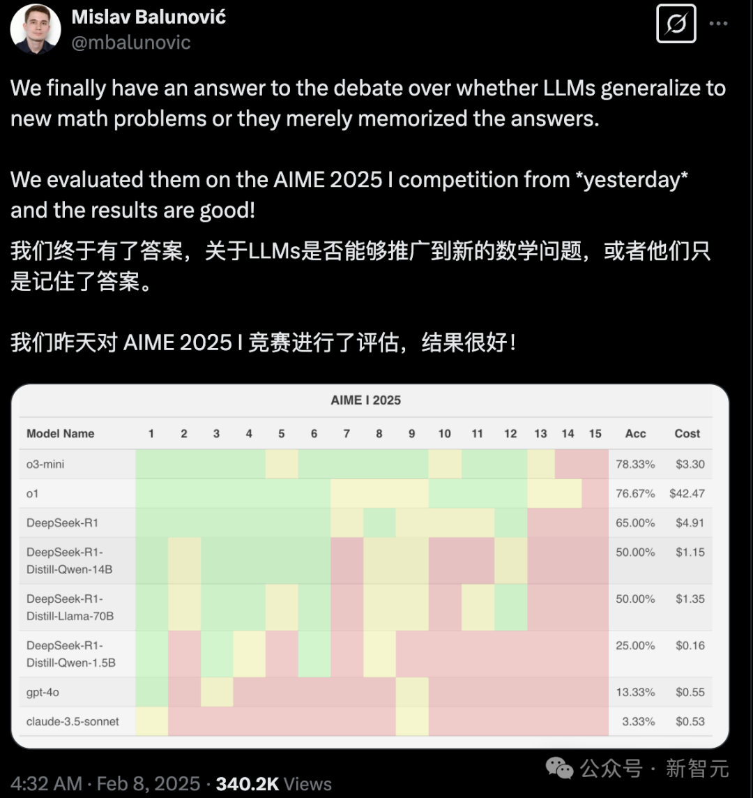 对此,来自苏黎世联邦理工学院的研究人员Mislav Balunović,在X上公开表示:「在数学问题上,LLM到底具有泛化能力,还是学会了背题,终于有了答案。」
