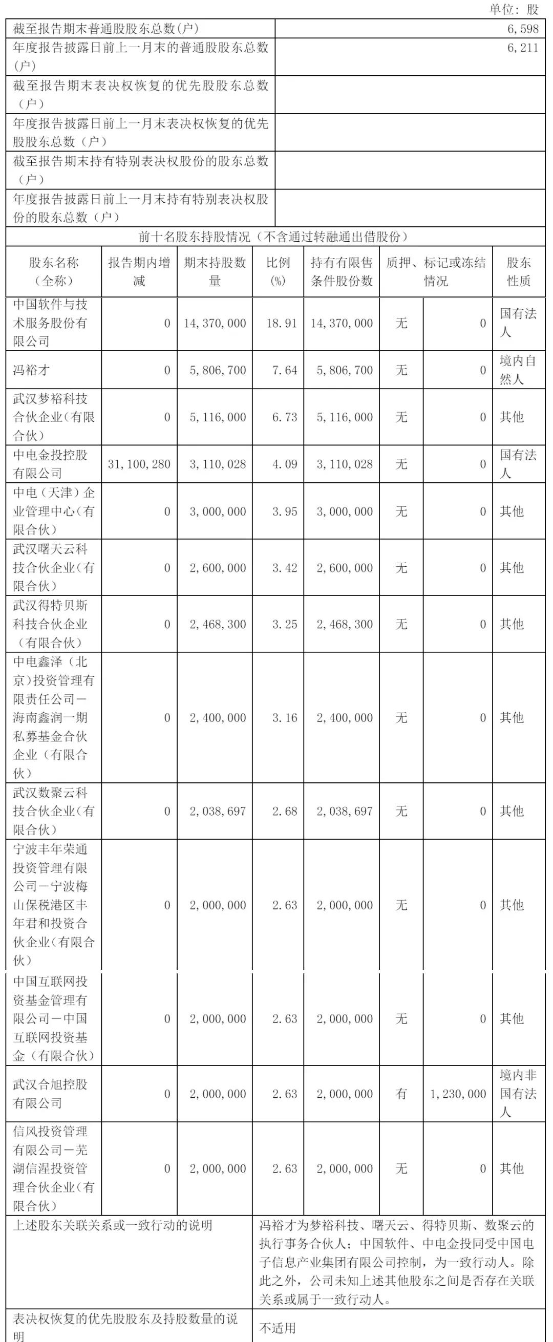截至2024年12月31日,中国软件与技术服务股份有限公司持股为18.91%,冯裕才直接持股为7.64%,武汉梦裕科技合伙企业(有限合伙)持股为6.73%,中电金投控股有限公司持股为4.09%;
