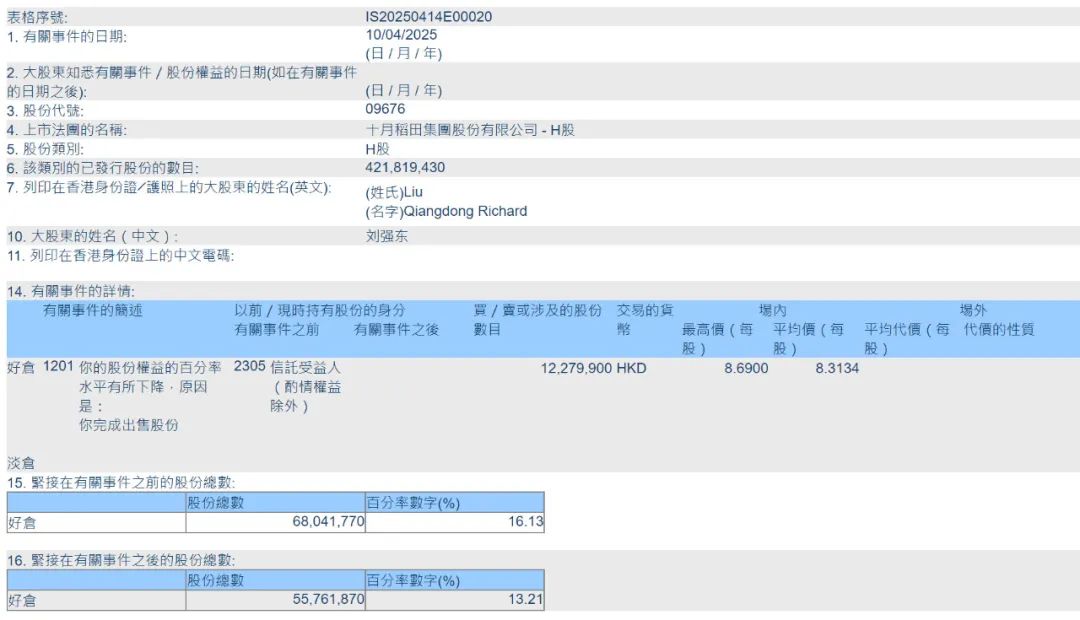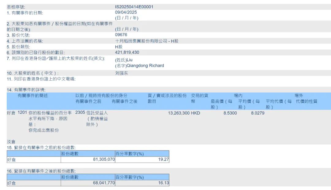 据港交所文件显示,京东集团CEO刘强东在2025年4月9日减持十月稻田(股票代码:“9676”)1326万股,减持均价8.0279元,套现1.06亿港元。