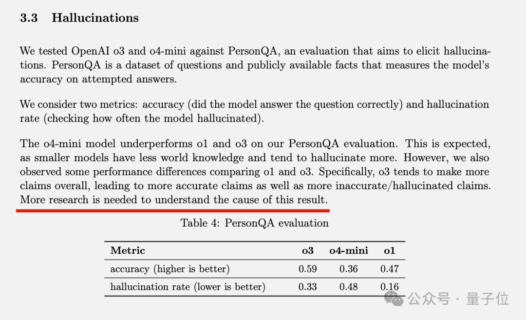 当大家带着疑问仔细阅读System Card,发现OpenAI官方也承认了这个问题,与o1相比o3幻觉率是两倍,o4-mini更是达到3倍。