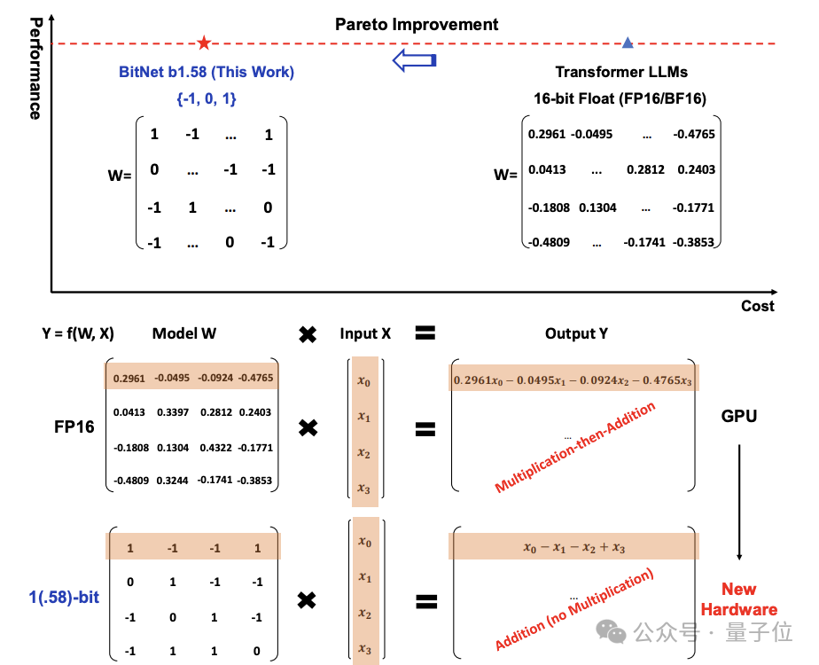之后,微软原班人马在上一篇论文的基础之上做了优化,提出BitNet b1.58,在原始BitNet的基础上增加了一个额外的0值。