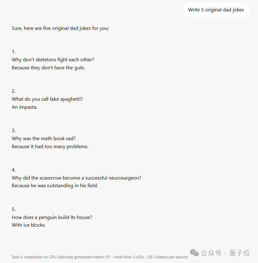 让它生成几个笑话,笑话简短但也蛮有意思: