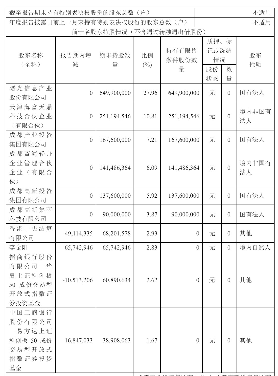 截至2024年12月31日,曙光信息产业股份有限公司持股为27.96%,为大股东;天津海富天鼎科技合伙企业(有限合伙)持股为10.81%,成都产业投资集团有限公司持股为7.21%,成都蓝海轻舟企业管理合伙企业(有限合伙)持股为6.09%;