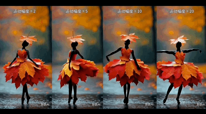 看看下图从其生成视频中截取的动图展示。从左至右,画面中的运动幅度依次为2 / 5 / 10 / 20(数值越大,动态性越强)。