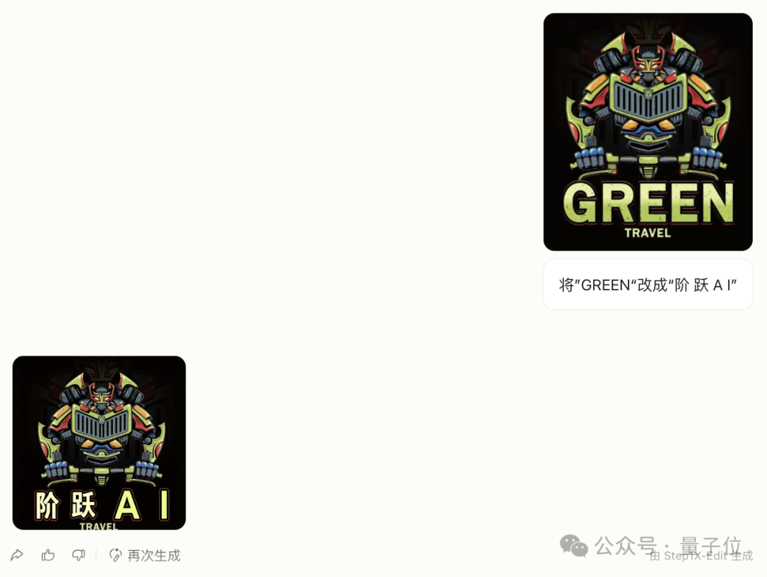 输入一张有两行字的图片,并指定让其中的“GREEN”修改为“阶跃AI”字样。