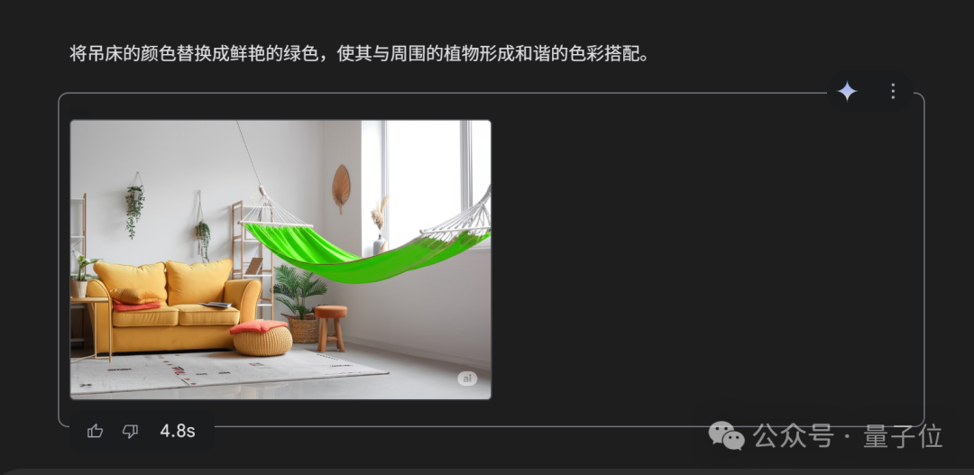 开启“找茬”模式后,我们不得不承认它确实只更换了吊床颜色,其他素材均和原图一致。