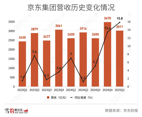 京东2025年第一季度财报显示,期内实现营收3011亿元,同比增长15.8%,连续两个季度保持两位数的同比增速,并且也创下了近三年营收增速新高。