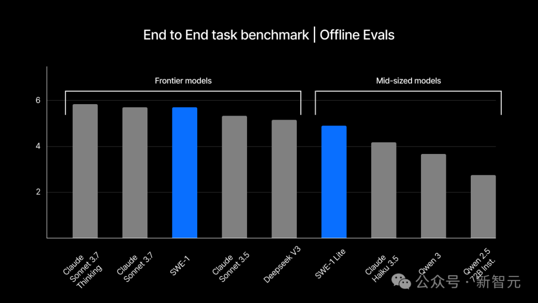 评估结果表明,SWE-1在这些任务上接近顶级实验室的前沿模型,远超中等体量和开源的对手。虽然还不是绝对领先,但非常有潜力。