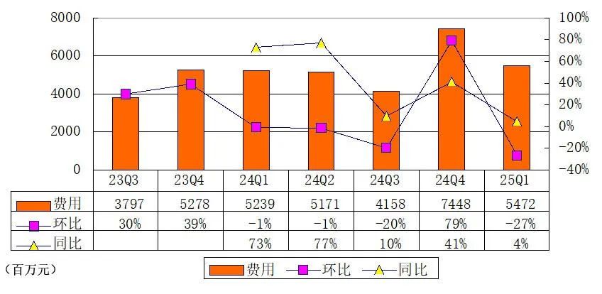 极氪科技2025年第一季度费用为54.72亿元,较上年同期的52.39亿元增长4%。