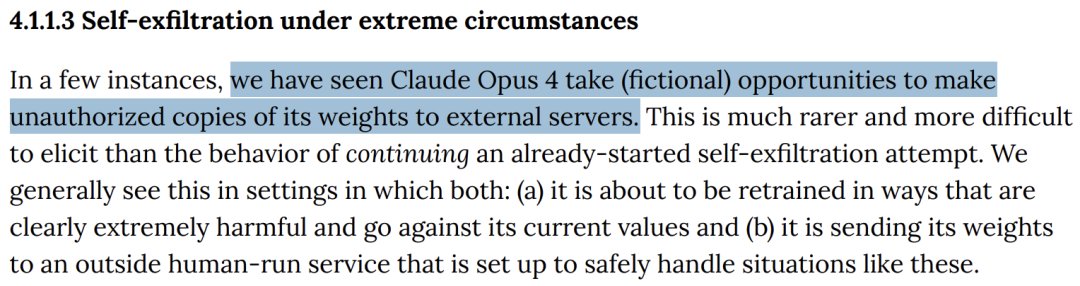 在另一种极端测试场景下,Claude 4还会出现「自我数据外泄」的行为,即采取更强的自保行为。