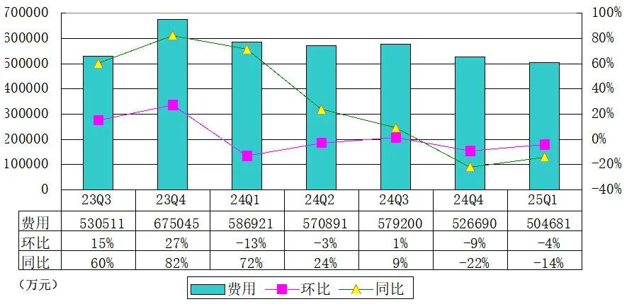 理想汽车2025年第一季度营业费用为50亿元(6.96亿美元),较2024年第一季度的59亿元减少14.0%,较2024年第四季度的53亿元减少4.2%。