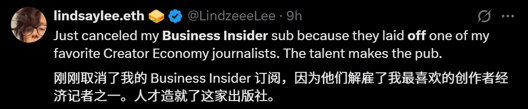 也有Business Insider的忠实读者表示,自己刚刚取消了订阅,因为自己最喜欢的经济记者被裁了。造就这家外媒的,是人才,而不是其他。