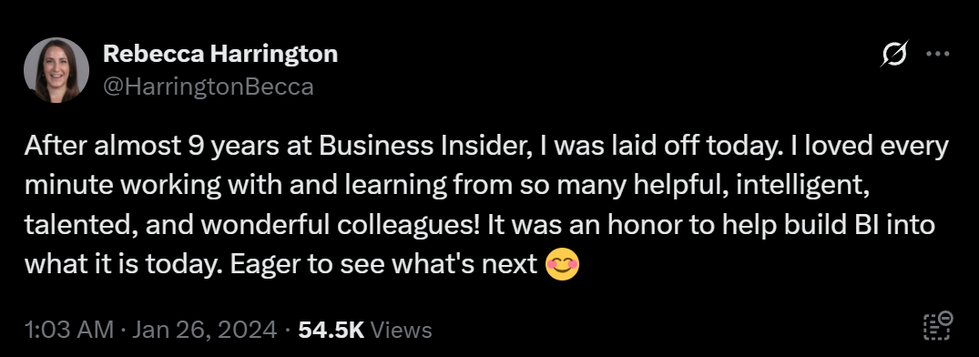 前执行新闻编辑Rebecca Harrington在这里工作了近9年,就在今天被裁员了。
