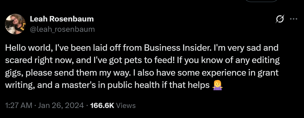 前编辑Leah Rosenbaum透露,自己现在非常伤心和害怕,而且还有宠物要养。她希望大家能向自己推荐编辑的工作机会。