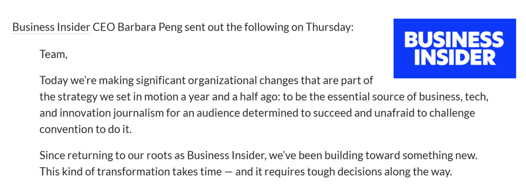 Business Insider决定缩减公司规模,此举将影响约21%的同事,并波及所有部门。