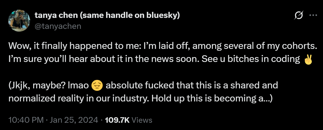 前数字文化编辑Tanya Chen写道:哇,终于轮到我了——我被裁员了,我的好几个同事也是。你们会很快在新闻里听说这件事。再见了各位,我去写代码了。