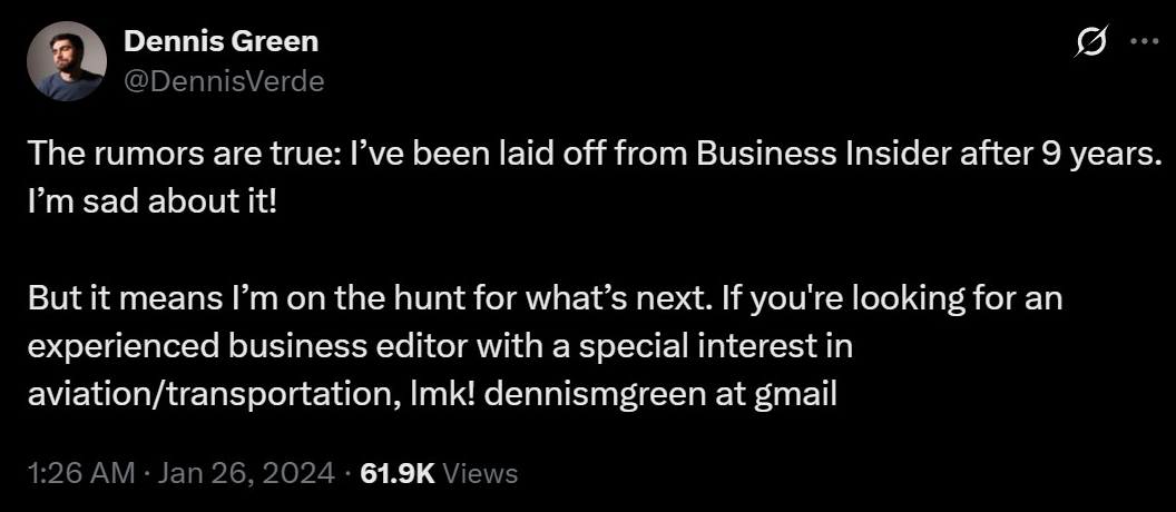 前高级编辑Dennis Green表示,靴子终于落地了,传言是真的。在Business Insider工作九年后,自己被裁了,真的很难过。