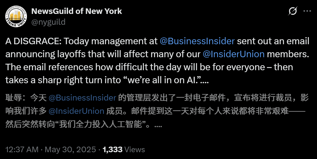 媒体工作者工会表示,Business Insider的行径,是一项巨大的耻辱,是公然背离新闻业,转向贪婪。