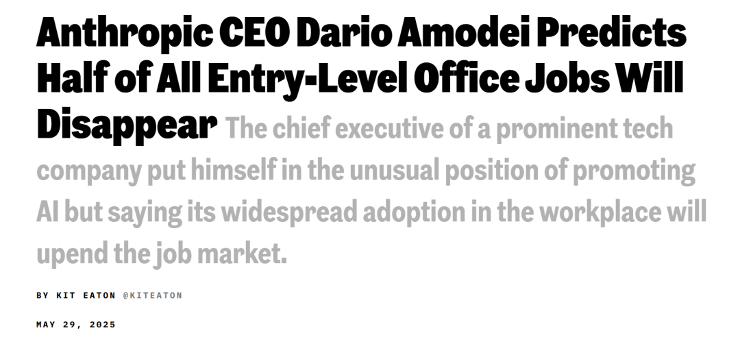 在接受采访时,他扔下了一枚重磅炸弹:AI可能会取代将近一半的入门级白领工作,并在未来一到五年内导致失业率飙升至10-20%!