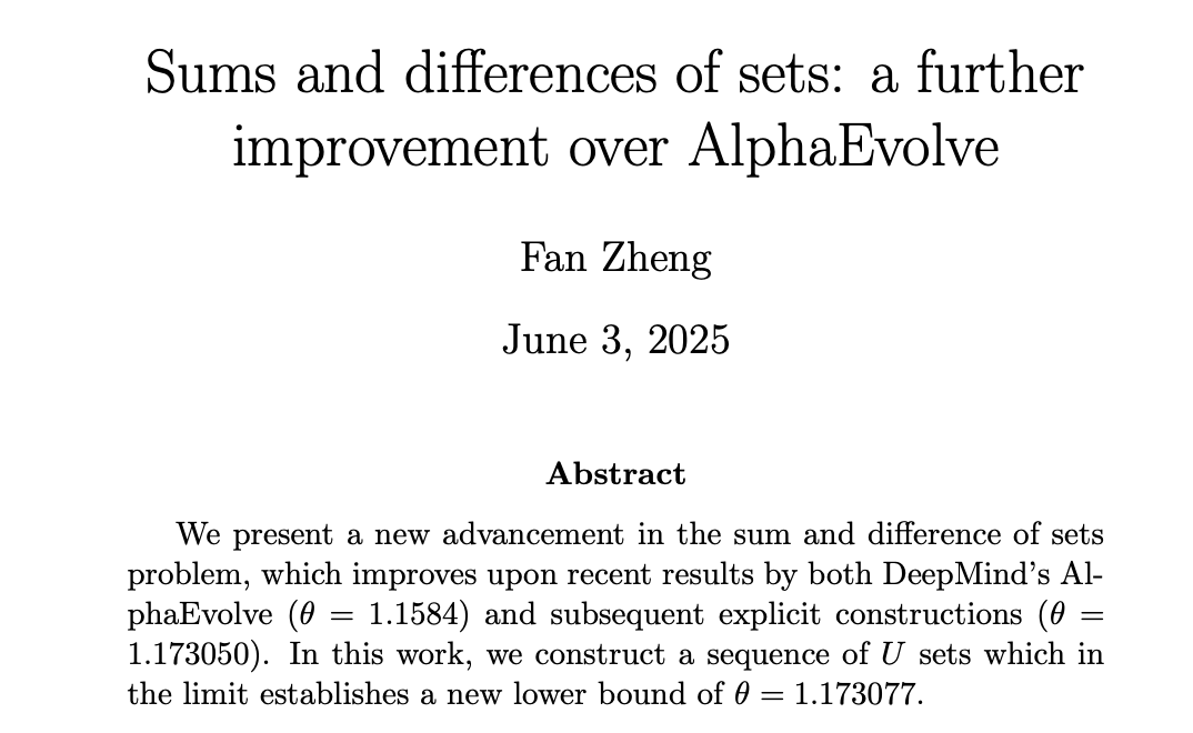 DeepMind于5月14日宣布AlphaEvolve,不仅改进了矩阵乘法算法,还取得一系列成果,打破集合和差问题(Sums and differences of sets problem)自2007年来的纪录也是其中之一。