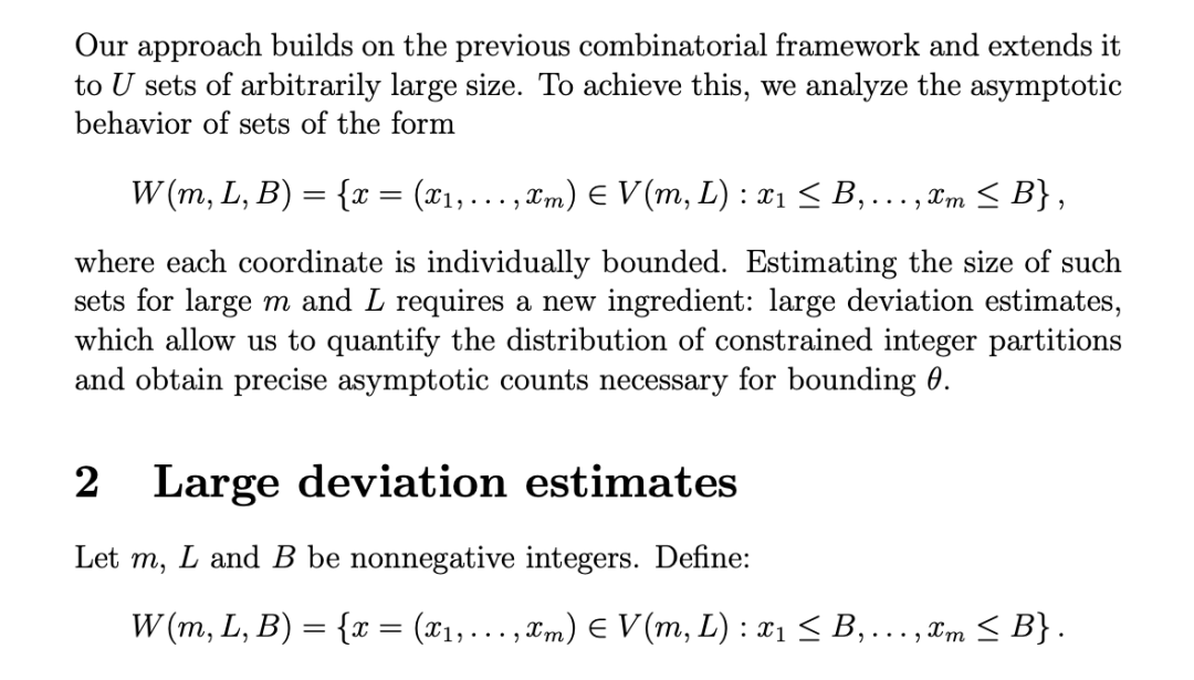 在Gerbicz结果的基础上,Fan Zheng又引入了大偏差估计(Large Deviation Estimates)作为渐近分析框架。分析当m和L很大时,集合W(m,L,B)的大小在极限情况下的规律。