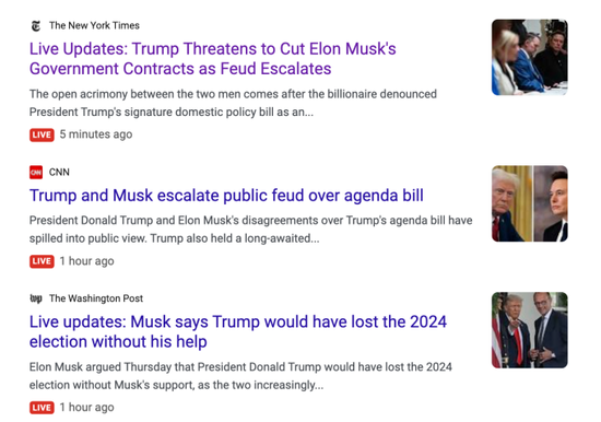 至此,两个人算是彻底撕破了脸。其后,特朗普也在他的社交平台上Truth Social和马斯克隔空互怼,争议重心逐渐从大而美法案偏离。