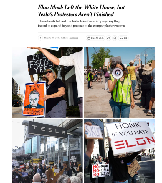 此外,特斯拉也成了不满马斯克DOGE行动的人士攻击的目标。“特斯拉下架”(Tesla Takedown)等抗议运动的兴起,抗议者呼吁公众抵制特斯拉产品并出售特斯拉股票,以表达对马斯克政治立场的不满。抗议活动在美国、加拿大、欧洲等地广泛展开,特斯拉门店和充电站成为示威的目标,甚至发生了破坏和纵火事件。