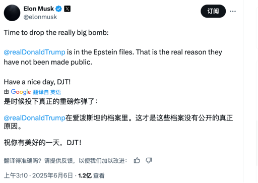 两个人已经吵了几个回合后,马斯克突然在X上发消息称:“是时候投下真正的重磅炸弹了:@realDonaldTrump 在爱泼斯坦的档案里。这才是这些档案未被公开的真正原因。”