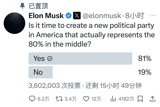 甚至,马斯克在X上发起投票并置顶——要不要创建一个中间党派,一个新政党。目前已经有超过300万人投票,81%选择了“要”。