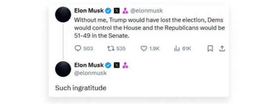 随着这条大呼大而美法案“令人作呕”的X消息,“朋友”的身份似乎被抛到九霄云外,一场恶战一触即发。