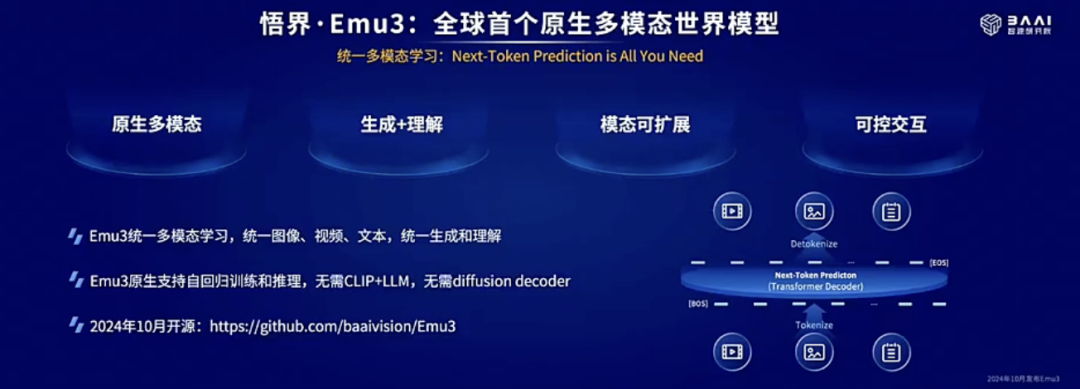 第一款模型就是去年10月份就发布的全球首个原生多模态世界模型Emu3。它实现了三个「统一」,包括统一了多模态学习,统一了文字、图像、视频等这些原生模态,统一了理解和生成能力。
