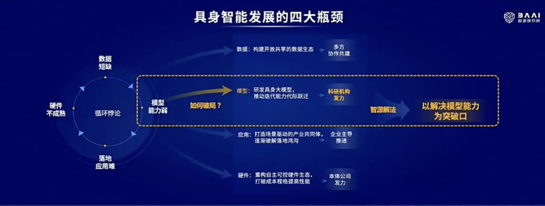 王仲远谈到了当前具身智能发展面临的四大瓶颈,包括硬件不成熟、数据短缺、模型能力弱、以及落地应用难。