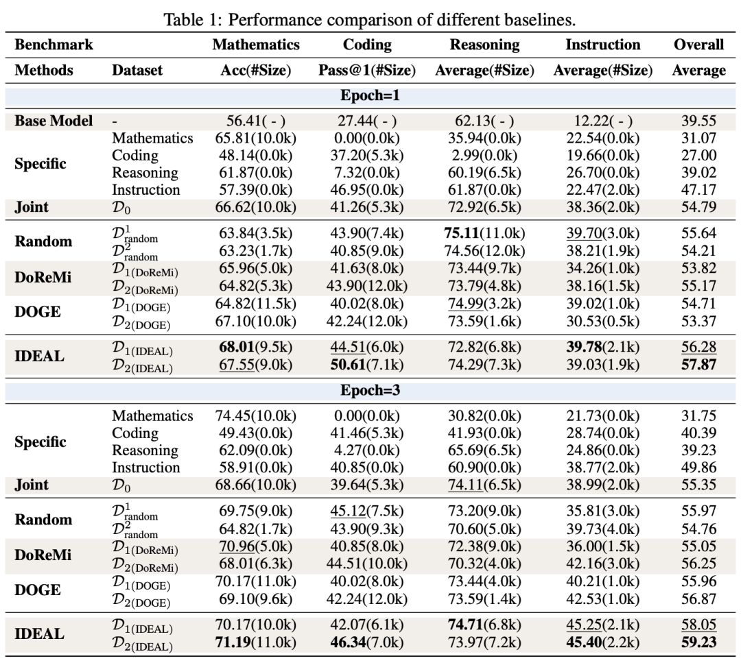 论文主要以Llama3.1 8B模型作为Base model,测试了IDEAL对四个典型领域上多任务训练的模型的提升效果。可以看到,无论是epoch1还是epoch3,IDEAL都能够在2轮迭代后将原先不擅长的Coding能力显著提升。