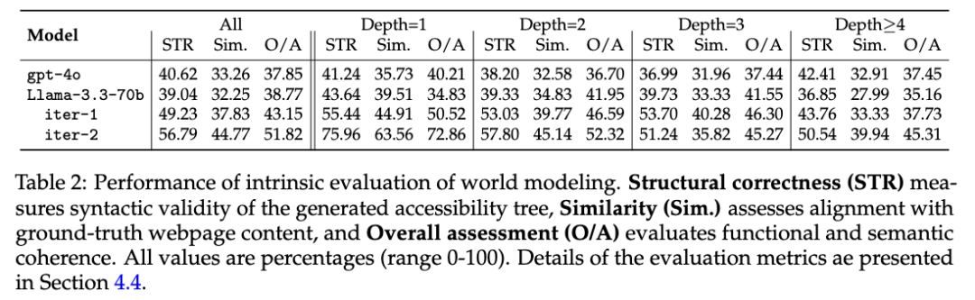 该评估体系有效验证了世界模型对网页状态变化的预测能力,为模型优化提供了量化依据。发现世界模型的能力随着自演进的步骤提升而上升。
