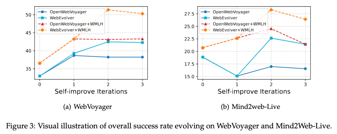 重复多轮(3轮)自演进之后,在WebVoyager和Mind2web-live数据集上进行测试,自演进结果: