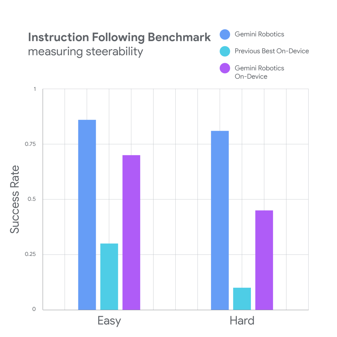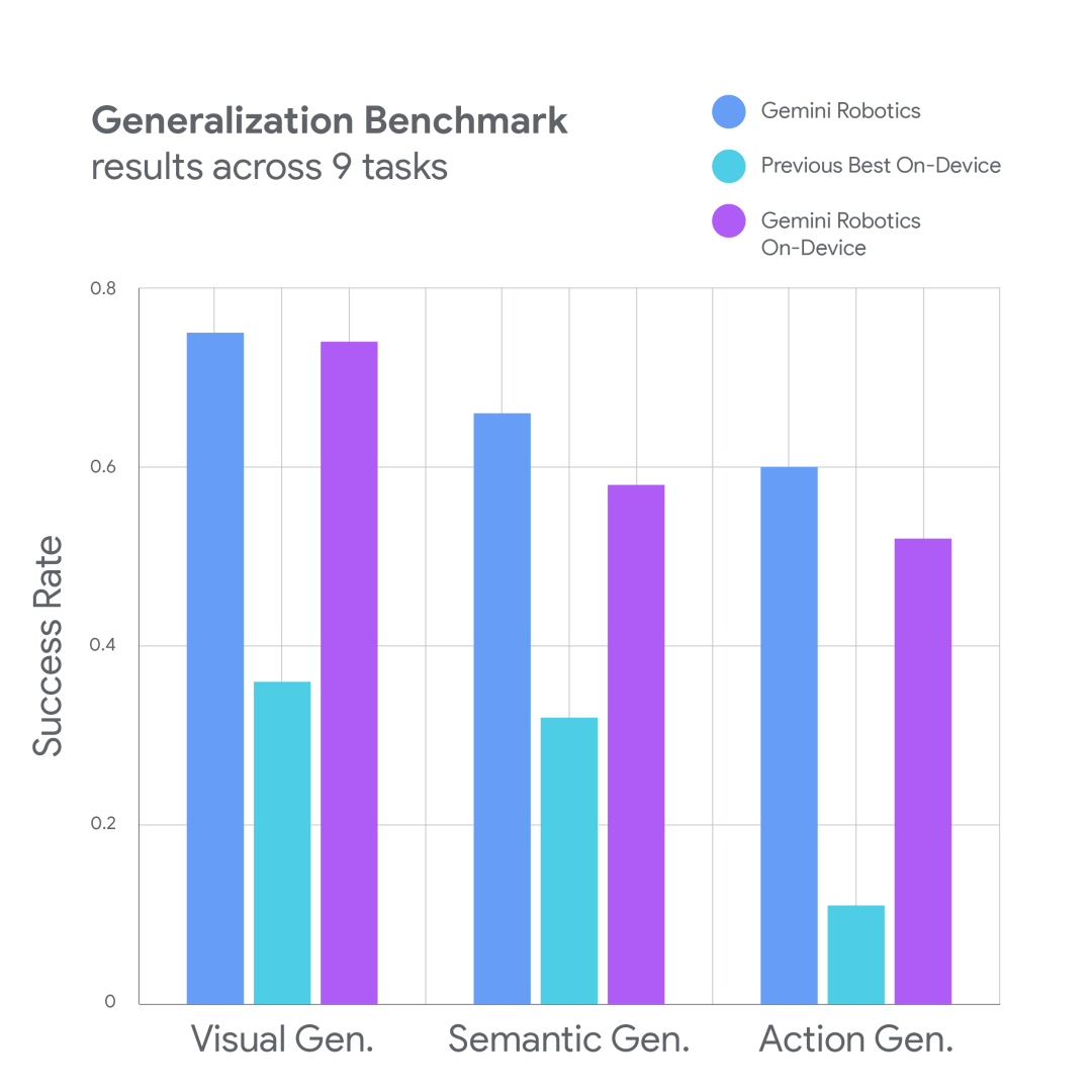 评测数据显示,On-Device版本在泛化性能测试中表现亮眼。在视觉泛化、语义理解和行为泛化等多个维度上,虽然比云端版本的Gemini Robotics略有差距,但已经大幅超越了之前最好的本地模型。