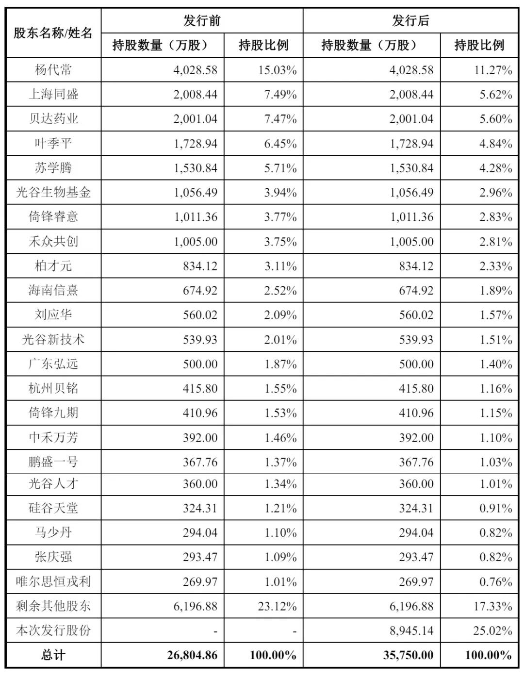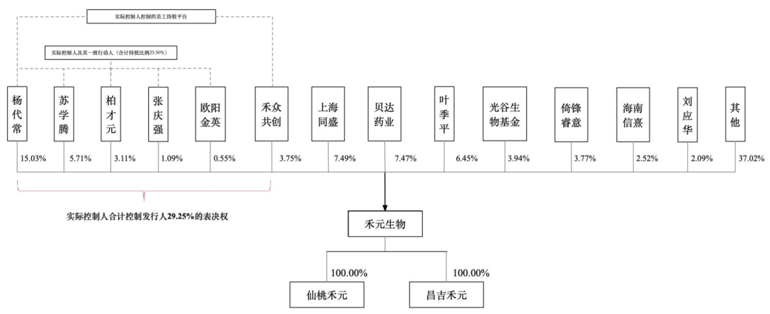 IPO后,杨代常直接持股11.27%,上海同盛持股5.62%,贝达药业持股5.6%,叶季平持股4.84%,苏学腾持股为4.28%,光谷生物基金持股2.96%,倚锋睿意持股2.83%,禾众共创持股2.81%,柏才元持股2.33%;