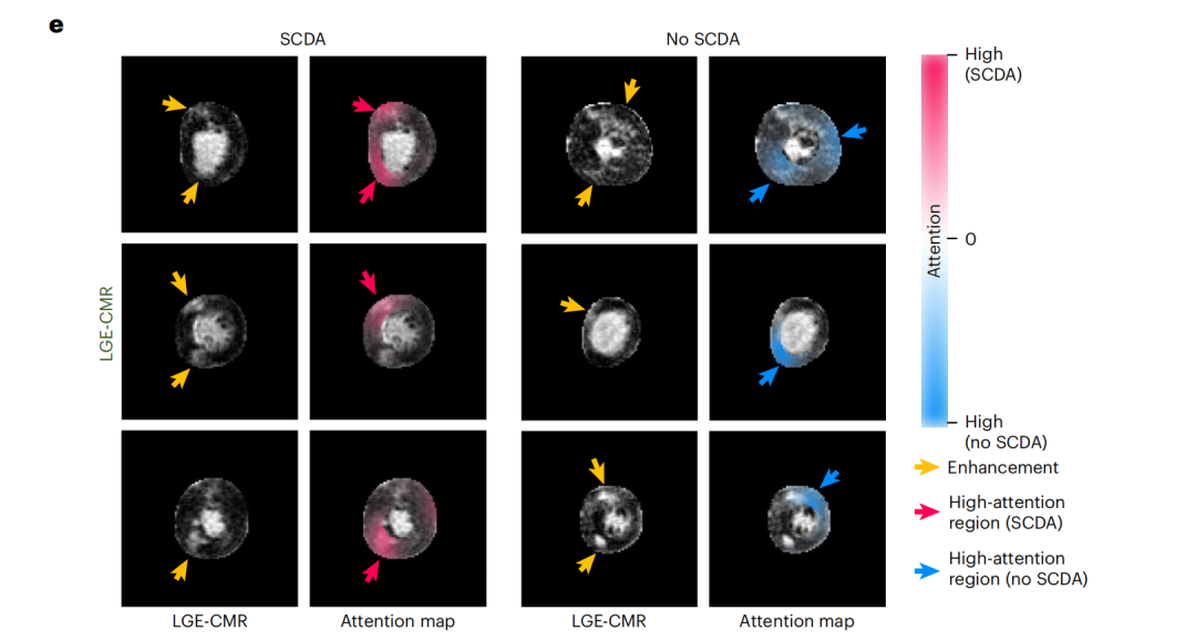 在LGE-CMR注意力图中,高风险患者注意力集中在增强区域(红色),低风险患者关注周围组织(蓝色)。