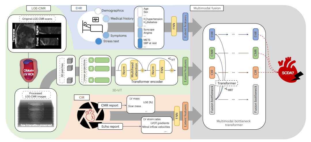 模型不仅能处理EHR中的40项结构化数据(如年龄、家族史、运动耐量测试结果);还能解析超声与CMR报告中的27项专业指标(如左心室射血分数、流出道压力阶差);通过3D-ViT网络直接学习LGE-CMR图像的三维空间特征。