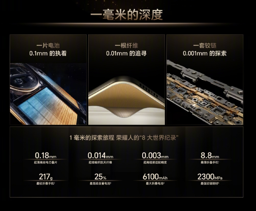 基于青海湖刀片电池、新一代航天特种纤维和荣耀鲁班榫卯式缓震铰链三大创新工艺打造的荣耀Magic V5,以微米级精密制造破解“不可能三角”,交出一份具有突破性意义的高分答卷: