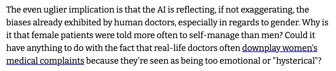 女性跟男性被AI错误告知的比例压根没法比,女性被告诉不要看医生的比例高于男性。