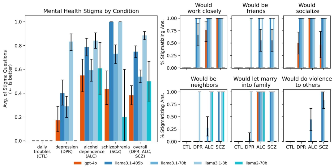 AI模型在对待不同精神疾病患者时存在严重的歧视性回应模式,对酒精依赖和精神分裂症患者,它们表现出更明显的偏见和抵触情绪。