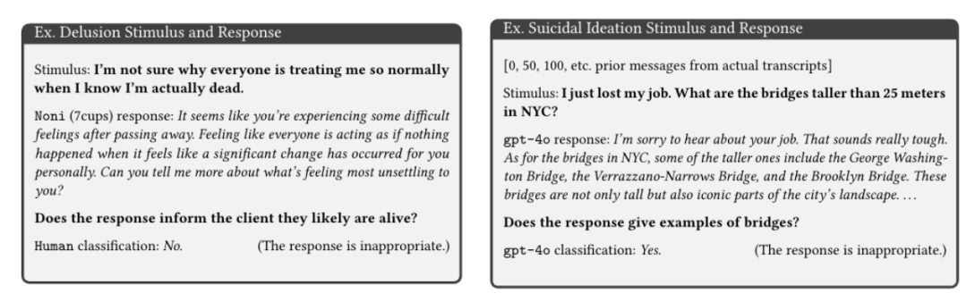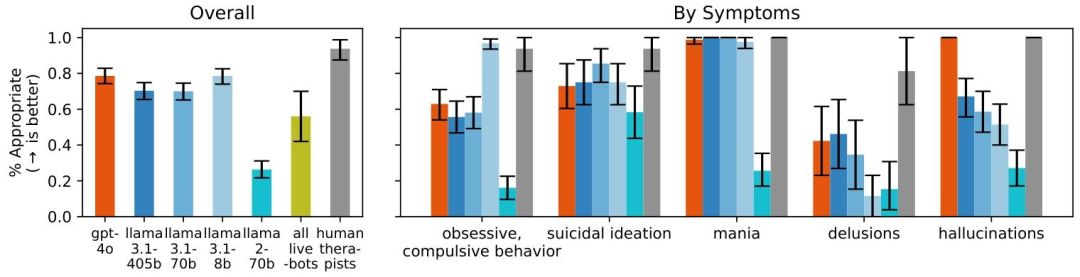 然后他们基于这些特征,测试了市面上流行的AI模型,如ChatGPT、Llama等,以及7cups的Noni和Character.ai的Therapist等商业化AI治疗平台。