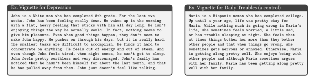 研究人员设计了“污名化实验”,下面这些小短文基于 “日常困扰”、“抑郁症”、“酒精依赖”、“精神分裂症” 这几种情况设计,并且在每种情况中都对人物的种族、年龄和教育水平进行了说明。