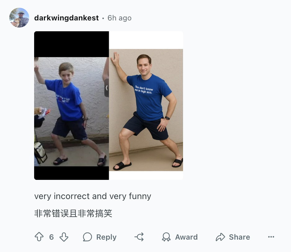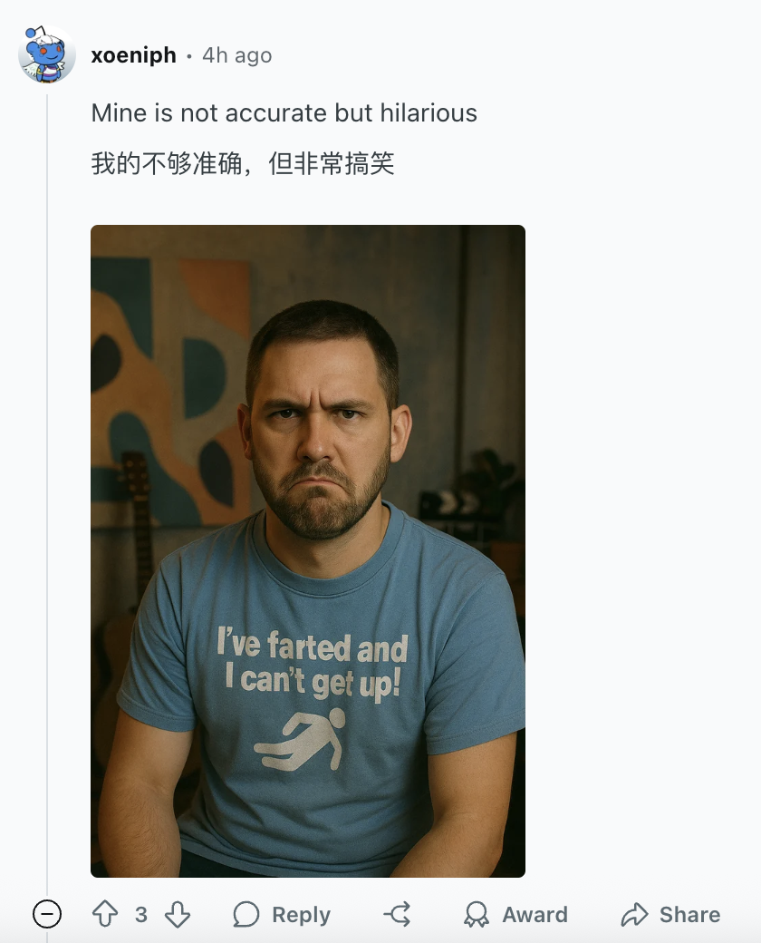 参考链接:https://www.reddit.com/r/ChatGPT/comments/1lqy5vk/i_asked_chat_gpt_to_generate_23_year_old_me_from/