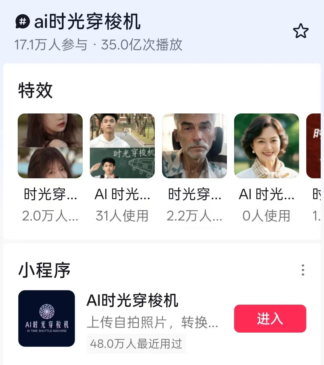 说起来,抖音上也有类似的特效,叫作“ai时光穿梭机”,目前(2025年7月4日)已经有17.1万参与。