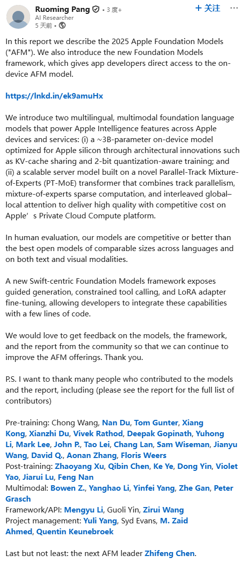 在LinkedIn的告别信中,庞若鸣不舍地写道,自己在离开前团队时,刚刚发表了一篇新论文,展示苹果在将大模型压缩至iPhone端运行上取得的进展。