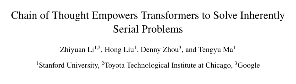 Denny Zhou和马腾宇等人的著作《Chain of Thought Empowers Transformers to Solve Inherently Serial Problems》提到如果给Transformer引入思维链,就能大大提高模型推理能力。